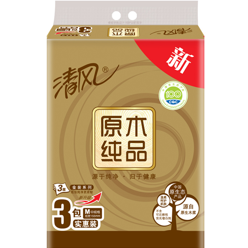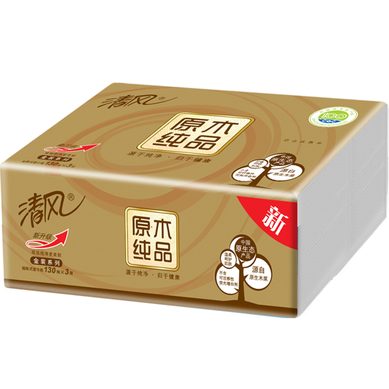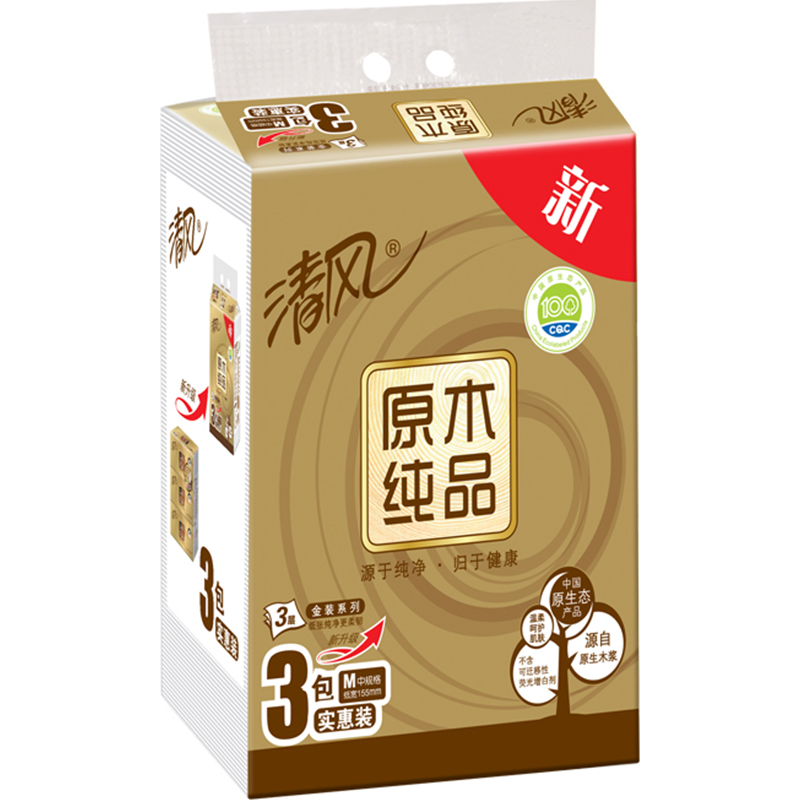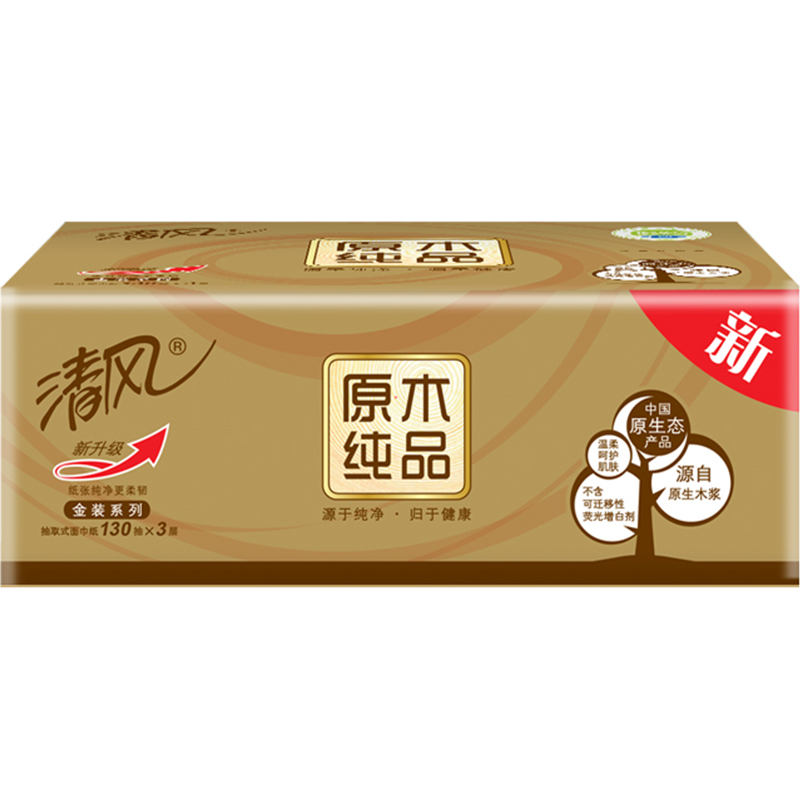 清风(APP)抽纸 原木纯品金装系列 3层130抽纸巾*3包